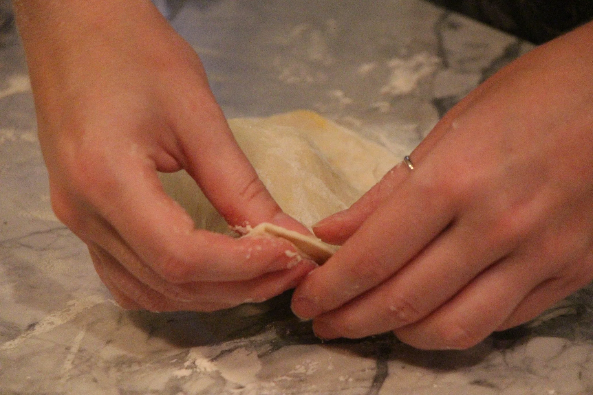 Spoon one heaping tablespoon of meat filling into the center, add one olive, some raisins and one egg slice on top of the meat. Using your fingers, rub the edge of the circle with water and fold the edges of the empanada together, creating a half circle. Fold the edges in to create a rectangle, or twist up the edges to keep it as a half circle. Just make sure to pinch the dough at the intersections to keep the pastry sealed.